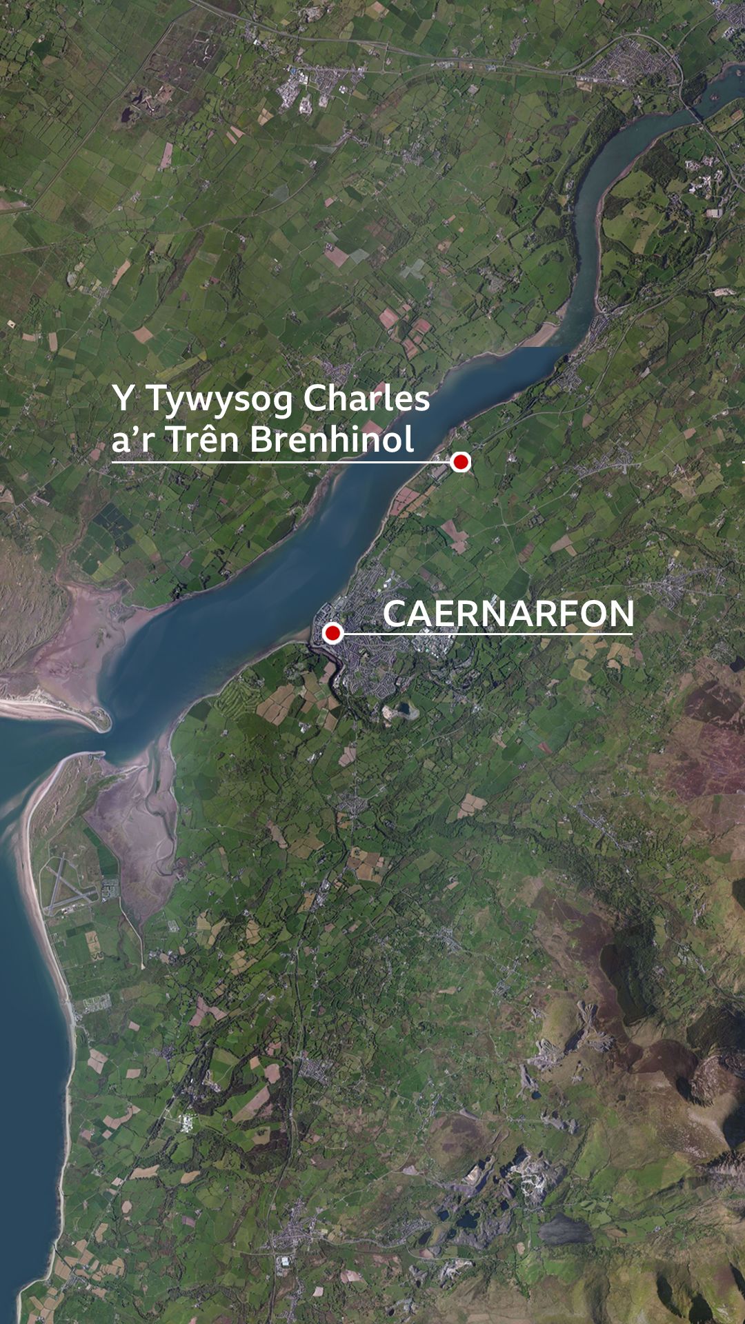 Gyda Charles yn dynesu drwy’r dorf at Borth y Dŵr ar lan y Fenai, mae’r Frenhines a Dug Caeredin gydag aelodau eraill y teulu brenhinol, yn gadael Ferodo yn eu cerbydau nhw.