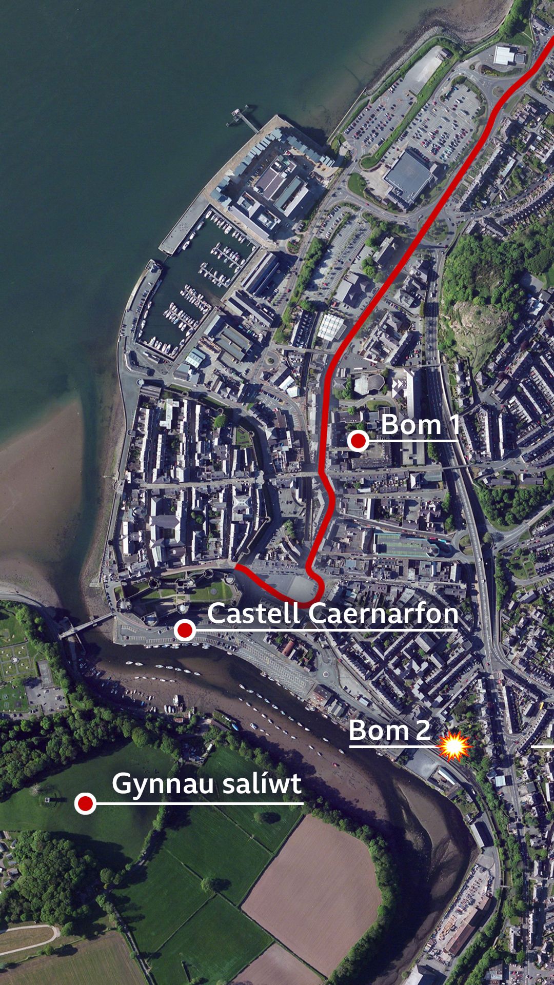 Roedd y bom yma wedi ei osod yng ngardd Prif Gwnstabl Gwynedd ar lwybr Love Lane ac yn cefnu ar y rheilffordd lle roedd y trên brenhinol wedi ei barcio erbyn hyn.