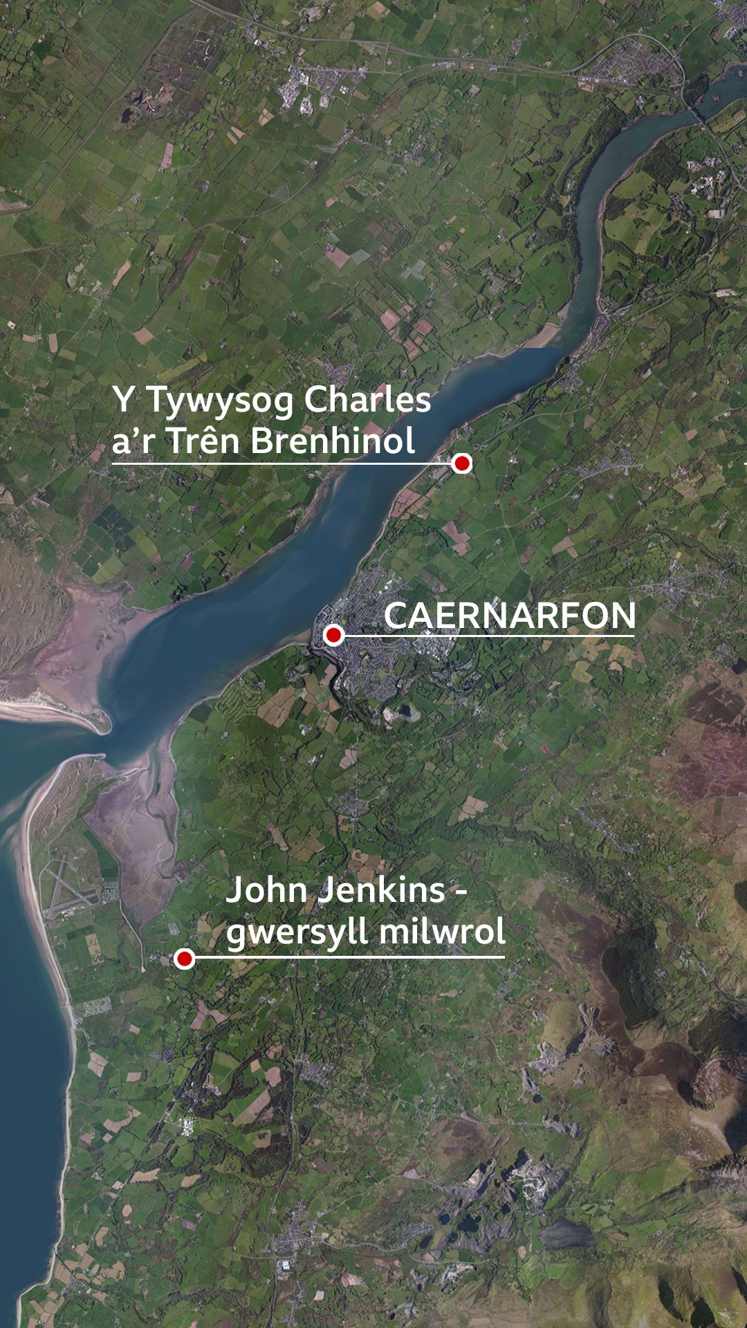 Gyda'r Tywysog Charles ar ei ffordd o Gaergybi i ymuno gyda gweddill ei deulu yn y trên brenhinol mewn gorsaf ger ffatri Ferodo y tu allan i Gaernarfon, mae John Jenkins wedi ei gyfyngu i'r gwersyll yn Llandwrog lle mae'n aros am fwy o newyddion.